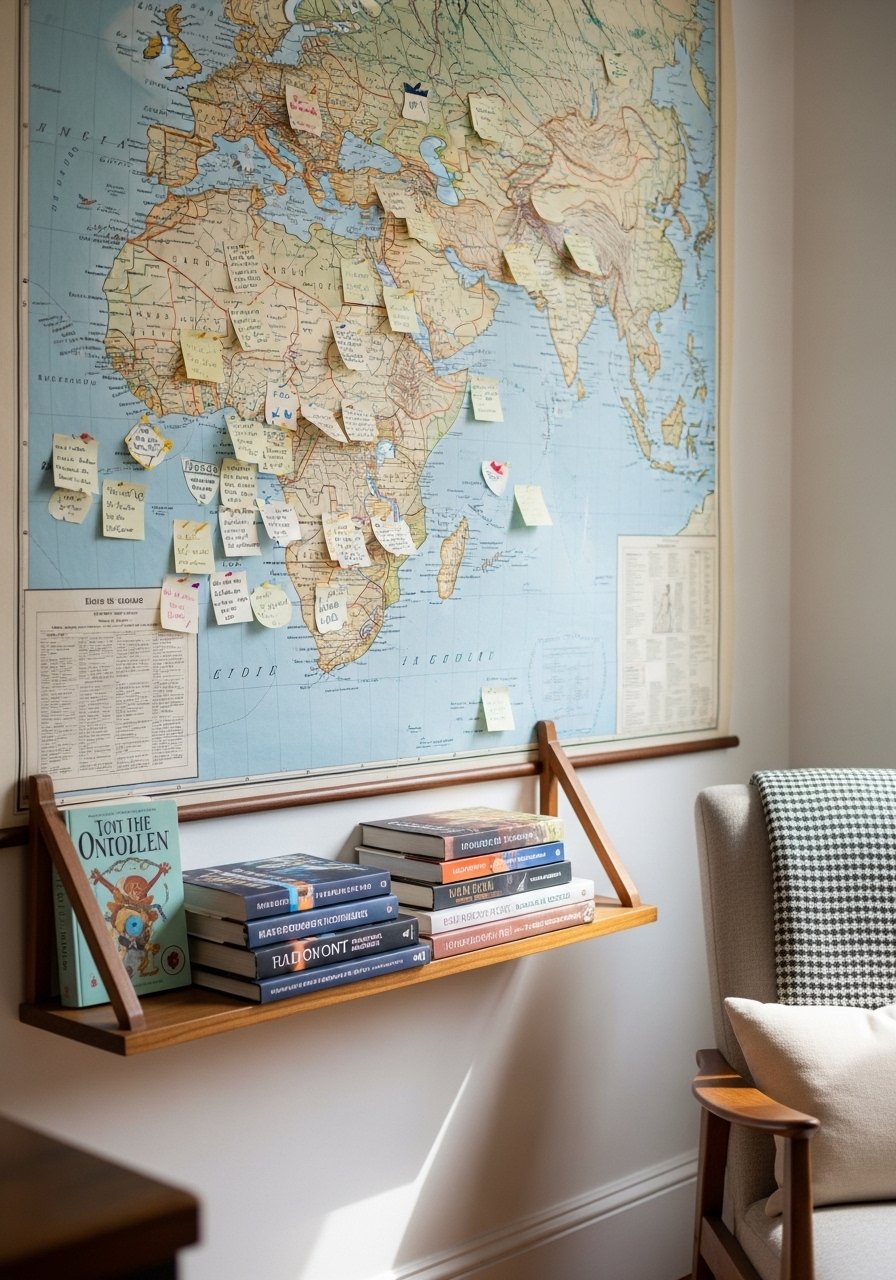 I pinned a world map and marked books set in each country, and suddenly picking a book became a micro-ritual. Use corkboard strips and a slim floating-shelf for displays. It’s a unique conversation starter and helps organize reading goals.