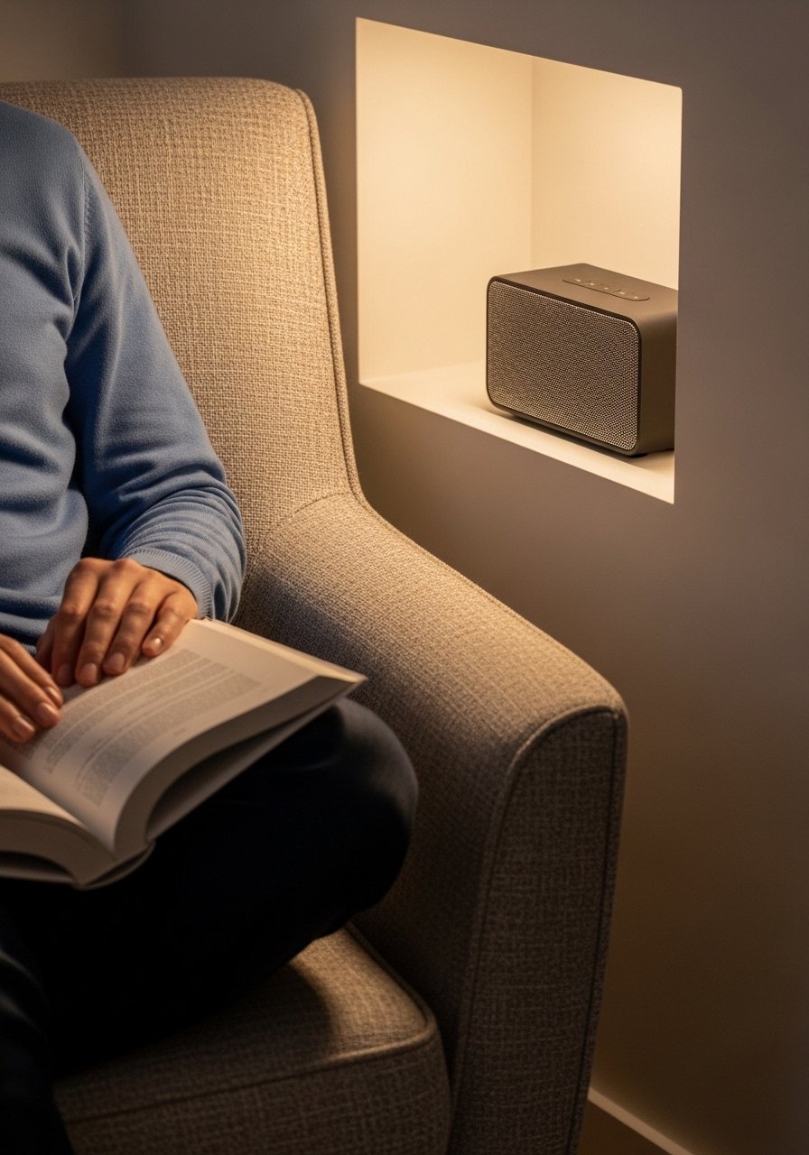 I hid a small bluetooth-speaker in the shelf and now ambient sound or audiobooks are seamless. Wiring discreetly matters, so pick rechargeable or compact models. Music or soft ambient tracks change the mood and help focus for me.