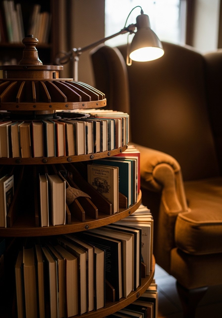 I installed a small rotating book wheel so covers face forward and switching books became easier. It’s fun, tactile, and keeps a curated selection visible. Use a sturdy base and balance heavier books evenly. A side-table holds a mug and bookmark.