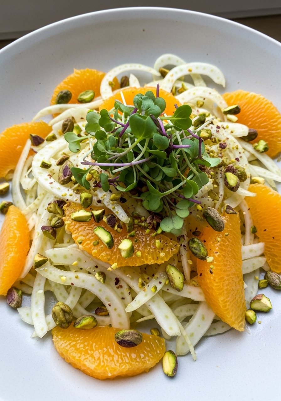 Paper-thin fennel adds a crisp anise note that plays well with sweet oranges and toasted pistachios. Toss with a citrus vinaigrette (fresh orange juice, lemon, olive oil) and let it sit 10 minutes for flavors to marry. I use a mandoline-slicer occasionally for even shaves when entertaining. This one is a great palate cleanser between heavier courses.