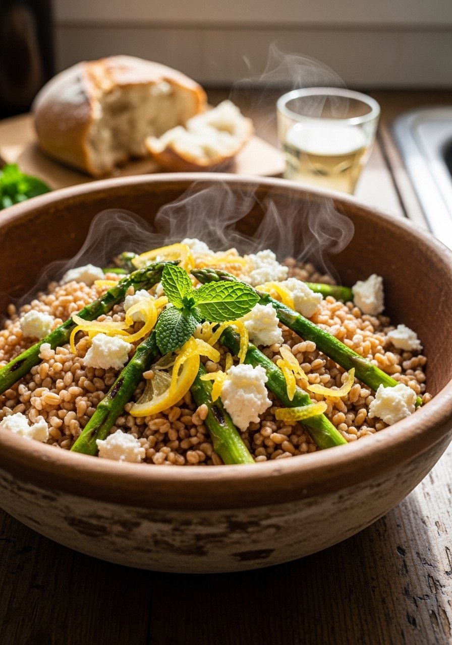 Toasted farro holds dressings and adds chew, while grilled asparagus contributes springtime smokiness. Stir in diced preserved lemon and plenty of mint; a spoonful of goat-cheese gives creaminess. I often make the farro ahead—leftovers taste even better cold. About half the people I host prefer grain salads as main dishes, so this doubles as a hearty option.