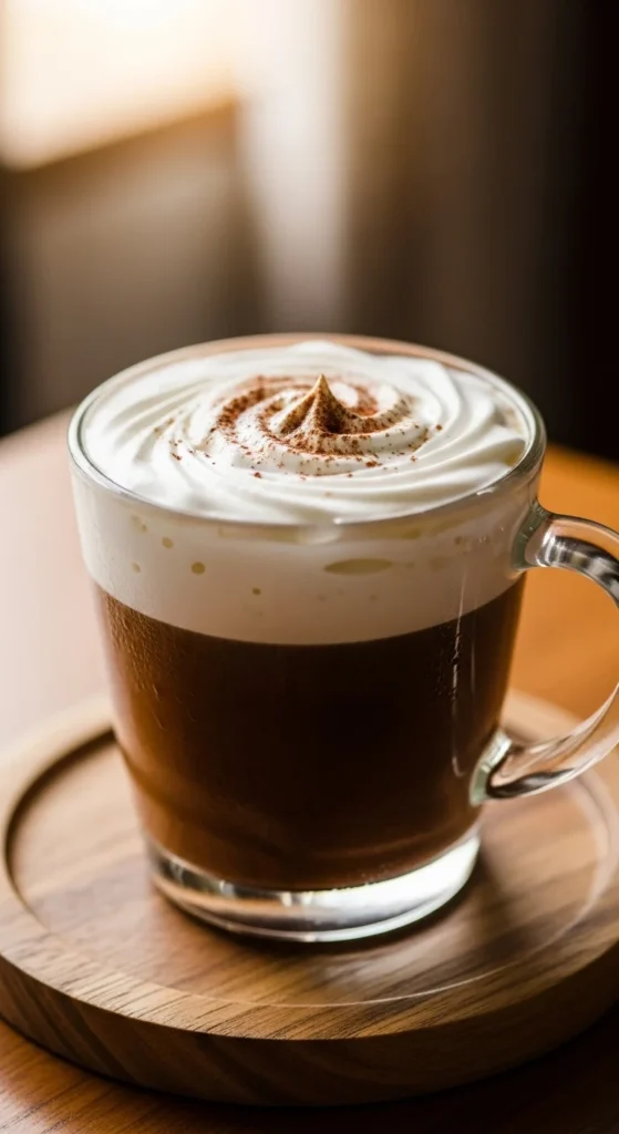 Serve hot. Do not stir cream. Add chocolate shavings. After-dinner drink. Cozy feel.