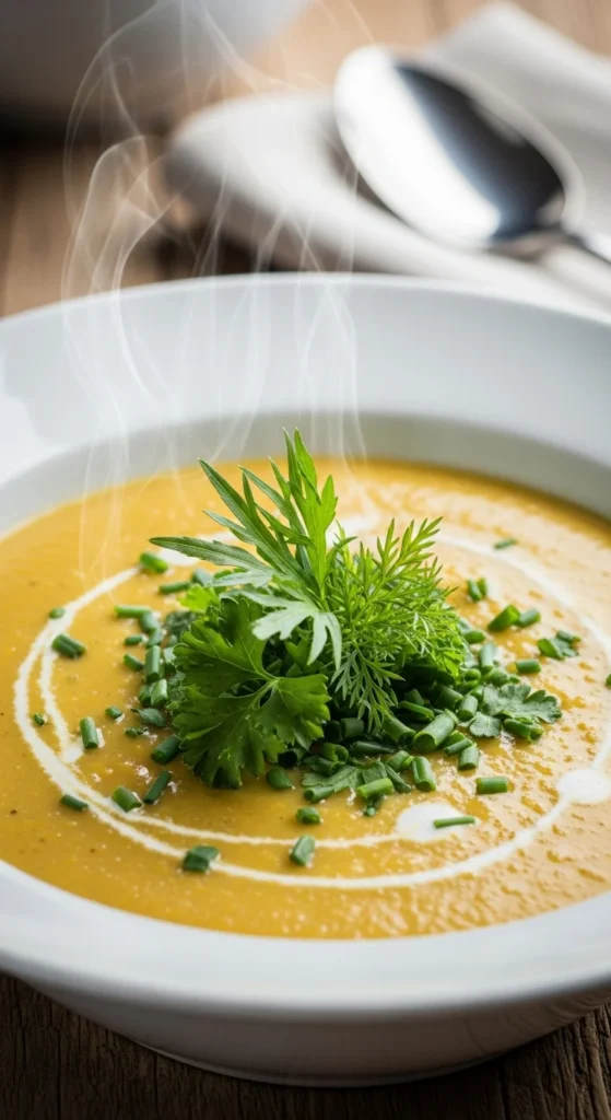 Add croutons. Drizzle cream. Serve warm. Great starter. Garnish with chives.