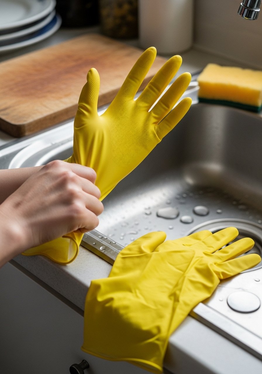 I thought gloves were fuss, until I went without them for a week and my nails peeled. Wearing gloves for washing dishes and cleaning prevents prolonged wetting that weakens nails. Keep inexpensive pairs by the sink. I prefer slightly textured ones for grip. They save a lot of manicures in the long run.