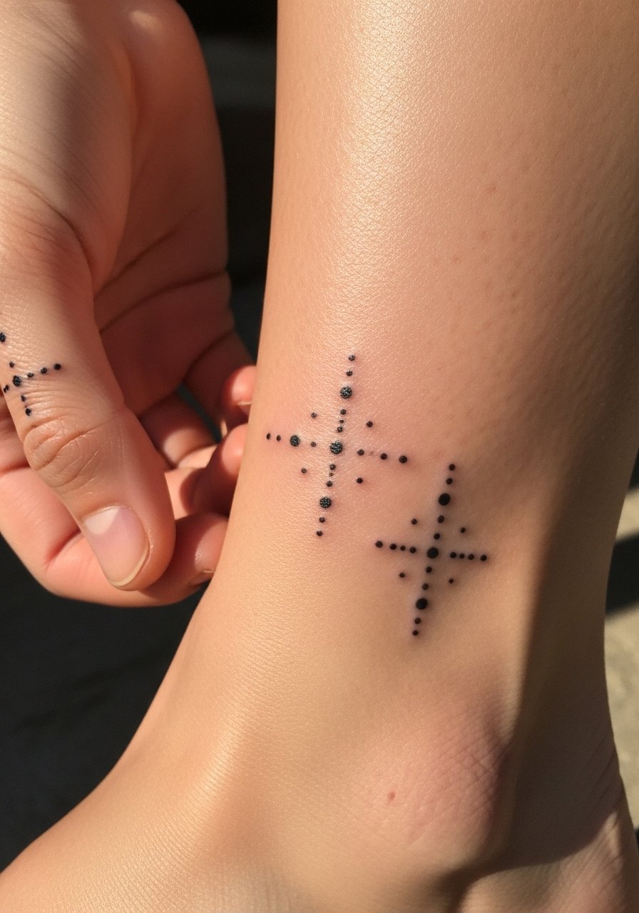 A tiny constellation reads like a private map — place it where you can glance at it. I suggest spacing dots conservatively so individual stars don’t merge as the ink spreads. Use a light aftercare salve like healing-salve and avoid tight rings or socks while it flakes. Constellations pair beautifully with small script or a single accent star for a layered story.