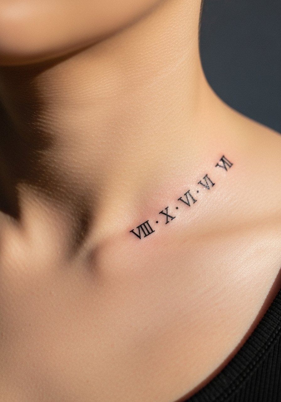Roman numerals are timeless and discreet. I recommend bold-enough strokes so digits don’t blur — around 1/16–1/8 inch line width. They pair well with a light clear-bandage while healing and minimal rubbing from clothing. For touch-ups later, budget for a quick session; I’ve noticed clients often return after a year for refinement. Protect them from sun with a non-greasy SPF once healed.