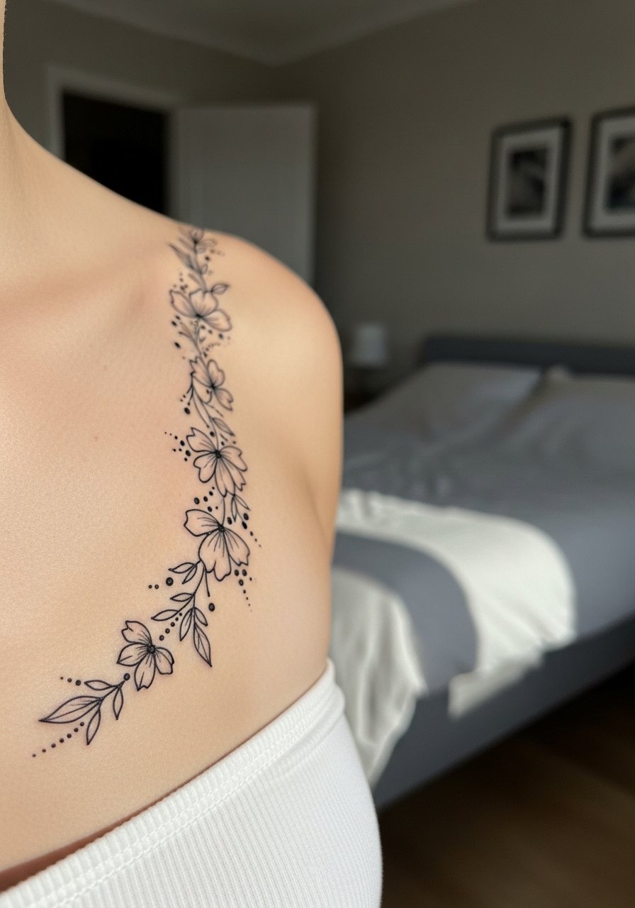 A single floral stem is quietly personal and photographs beautifully. I favor designs with small negative-space highlights rather than heavy shading to avoid early fading. For aftercare, a fragrance-free moisturizer like tattoo-ointment keeps details crisp while healing. Placement along the rib or side creates movement with breath and clothes, which is why I recommend slightly larger scale there.