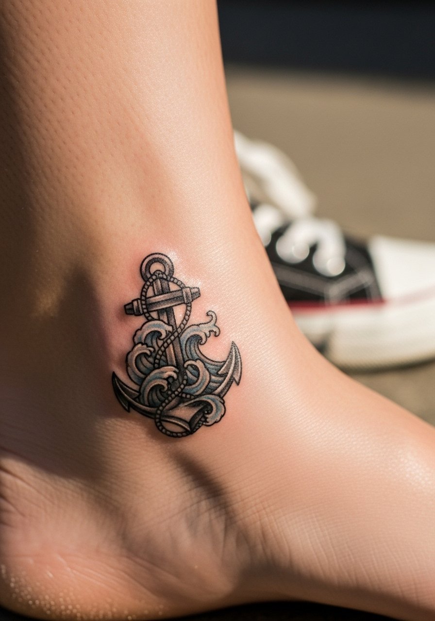 Anchors signal steadiness; the tiny wave adds motion. I suggest a modest pop of color for contrast but keep saturation low to avoid early fading on high-movement spots like the foot. Use a breathable bandage initially and consider spf-50-sunscreen after healing to protect exposed spots. This combo reads well in casual or nautical wardrobes and needs occasional touch-ups.
