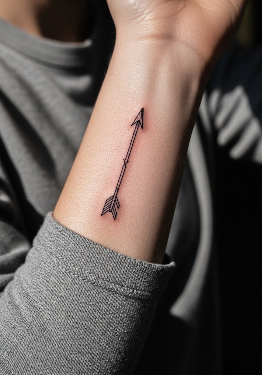 An arrow symbolizes direction and intent. I prefer a slightly bolder shaft to prevent breakup and recommend 1–2 inches for forearms so the angle reads clearly. Use a thin layer of healing-salve during the peeling phase. Arrows pair well with script or coordinates and are an understated way to carry a message.