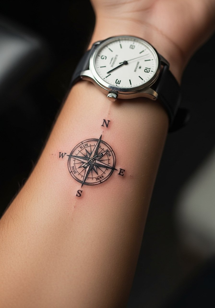 A micro compass suggests guidance without being showy. I recommend keeping directional points distinct and the needle slightly bolder to retain contrast. Consider a size around 1–1.5 inches. Aftercare with tattoo-aftercare-balm helps preserve the fine points. This design works well as a standalone or paired with coordinates.