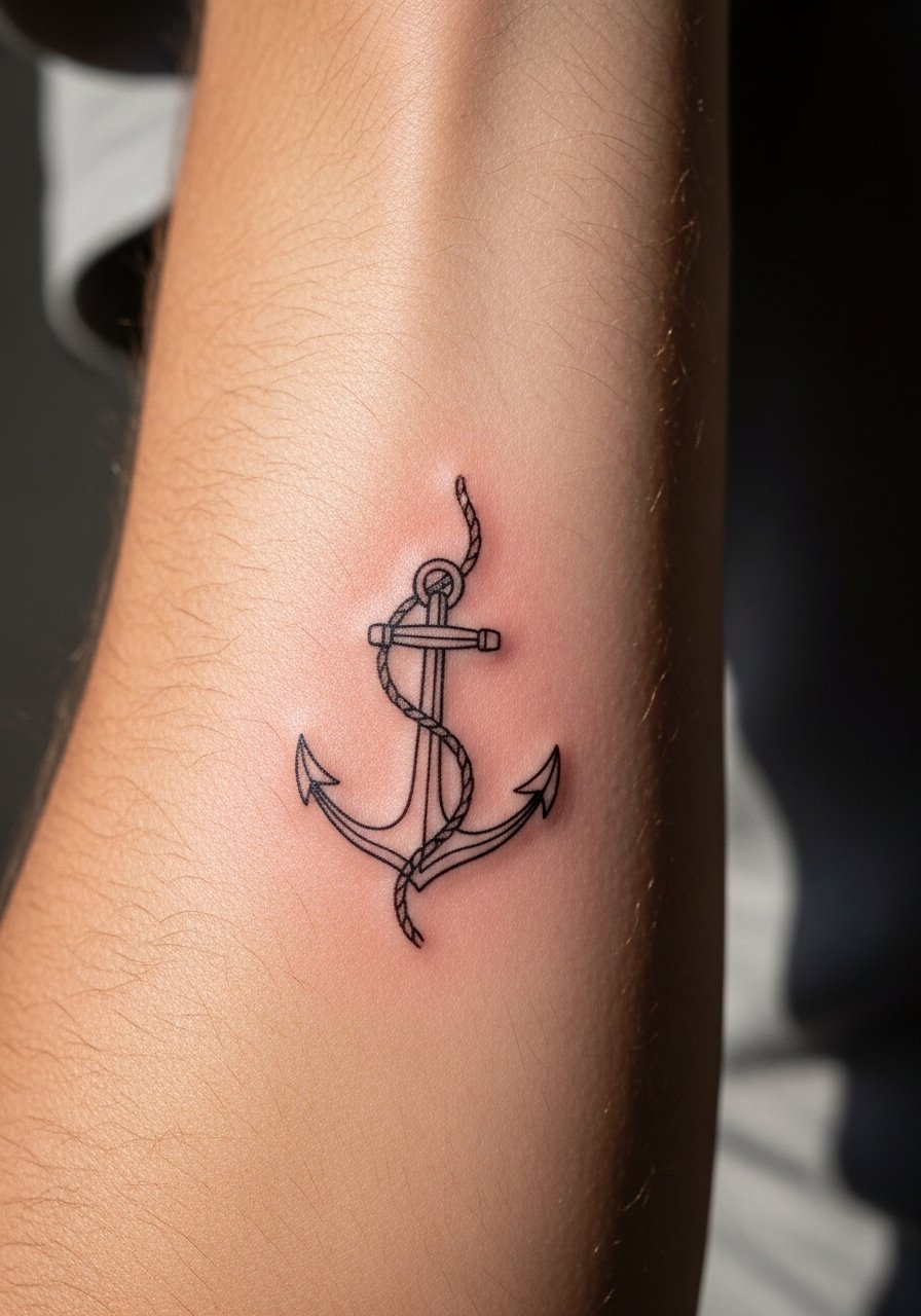 This single-line anchor variant is a fresh twist I’ve suggested when clients want symbolism without heavy ink. It requires a steady hand from an artist used to continuous strokes. Keep it at least 1.5 inches to preserve the single-line character. Pair with healing-salve and gentle cleaning; it reads modern and wearable.