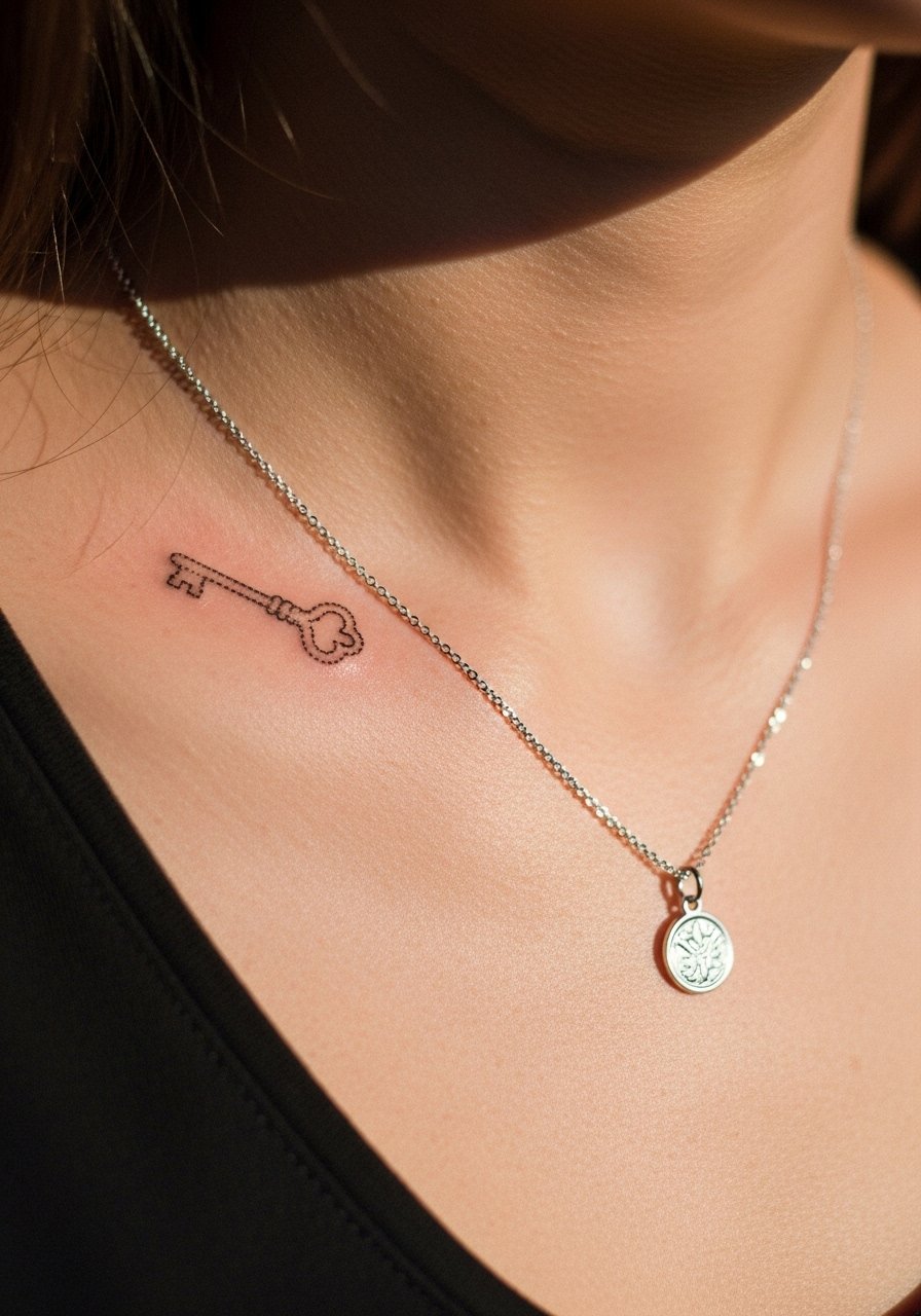 A small key can symbolize access or memory. Keep the key simple with a bold shaft and subtle bow detail; too many teeth will muddle. Size around 1–1.5 inches preserves the silhouette. A light aftercare balm like healing-salve during healing keeps edges crisp. Keys are versatile and often paired with initials.