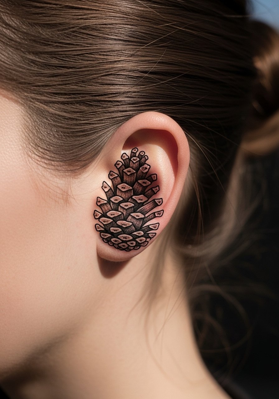 Pinecones and seeds suggest growth and grounding. I recommend modest dotwork rather than heavy shading so the texture persists. Keep it under 1.5 inches for behind-ear placements and expect a quick session. Aftercare with tattoo-ointment prevents scabbing that obscures details. These motifs are quietly symbolic and low-profile.