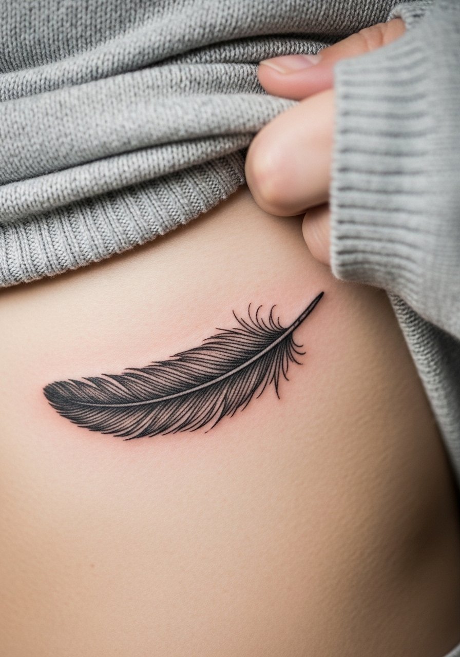 Feathers convey lightness and movement. I advise a gentle taper and slightly bolder quill to preserve shape. Place on areas with some flatness for better healing. Keep moisturized with fragrance-free-salve and avoid tight clothing rubbing the area. Feathers age elegantly when not overworked.