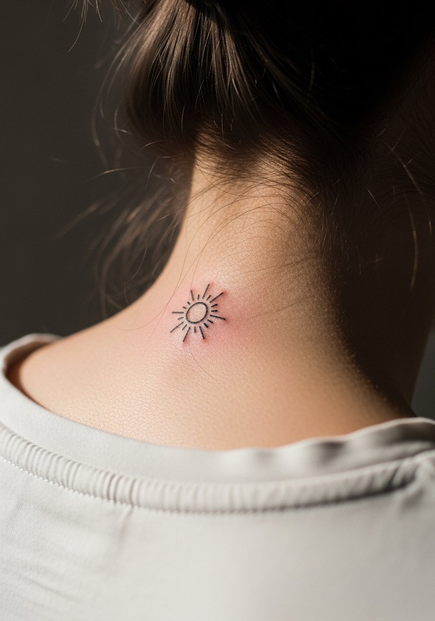 A tiny sun is a cheerful, simple reminder. I recommend short rays and a moderate center circle so the design doesn't become a smudge. Keep scale to 0.75–1.5 inches and use a light healing ointment like healing-salve during scabbing. Suns are versatile and work well with other small celestial tattoos.