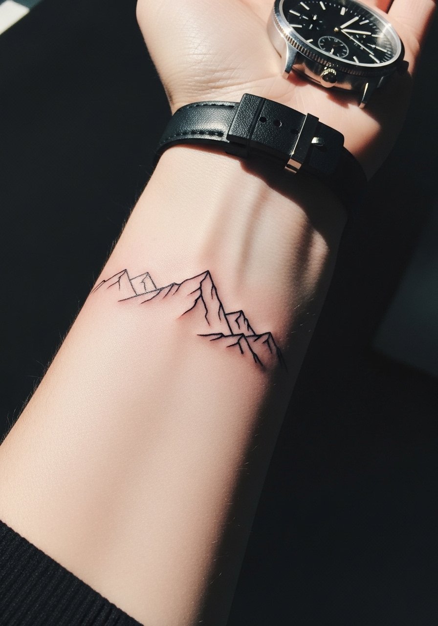 A wrist-wrap mountain range acts like a tiny landscape bracelet. I recommend slight gaps between peaks so the band doesn’t become solid. Expect 45–75 minutes and plan for minimal watch friction while healing. A gentle cleanser like green-soap at the studio and a protective ointment at home keep lines crisp.
