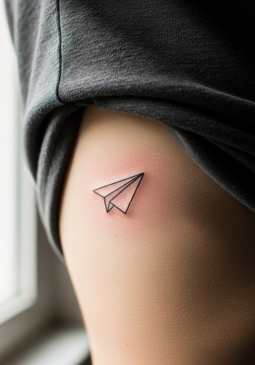 A micro paper plane suggests travel and whimsy. Keep folds minimal and the main crease slightly bolder to preserve shape. It’s a fast, low-pain option and pairs well with tiny directional marks. Aftercare with healing-salve and avoiding tight waistbands ensures it heals cleanly.