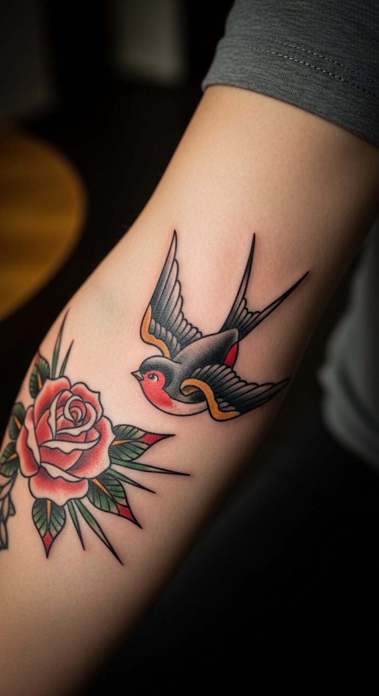 Old school readability is why I keep coming back to this. Bold black outlines prevent muddiness as the skin moves and ages, and saturated color holds surprisingly well. Size-wise, 3–6 inches keeps details clear on an arm. Pick an artist known for line consistency, because shaky lines are obvious a few years in. Expect basic aftercare routine, and plan for a touch-up in 5–10 years if you sunbathe a lot. I used tattoo-ink-black for reference.