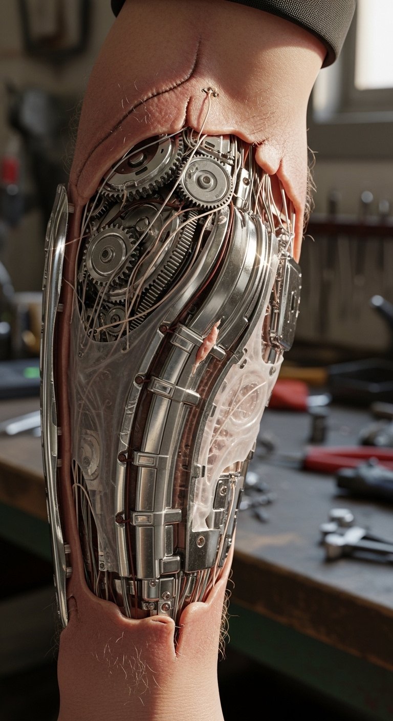 Style/Technique: 3D illusions blending mechanical elements with anatomy