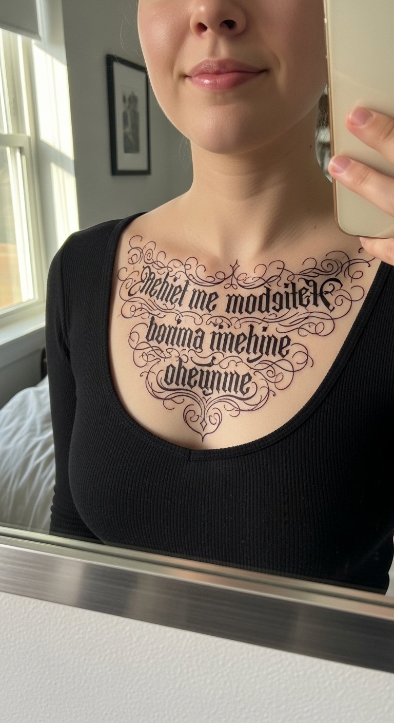 I had calligraphy inked across my chest and I noticed the negative space makes letters hold up. You need slightly wider strokes than pen work to avoid filling in. Placement on flatter surfaces like chest keeps lettering steady, avoid joints. Choose an artist who practices proportion and flow. Expect modest touch-ups for crisp edges after a year. I use ink-safe-cleanser during healing.