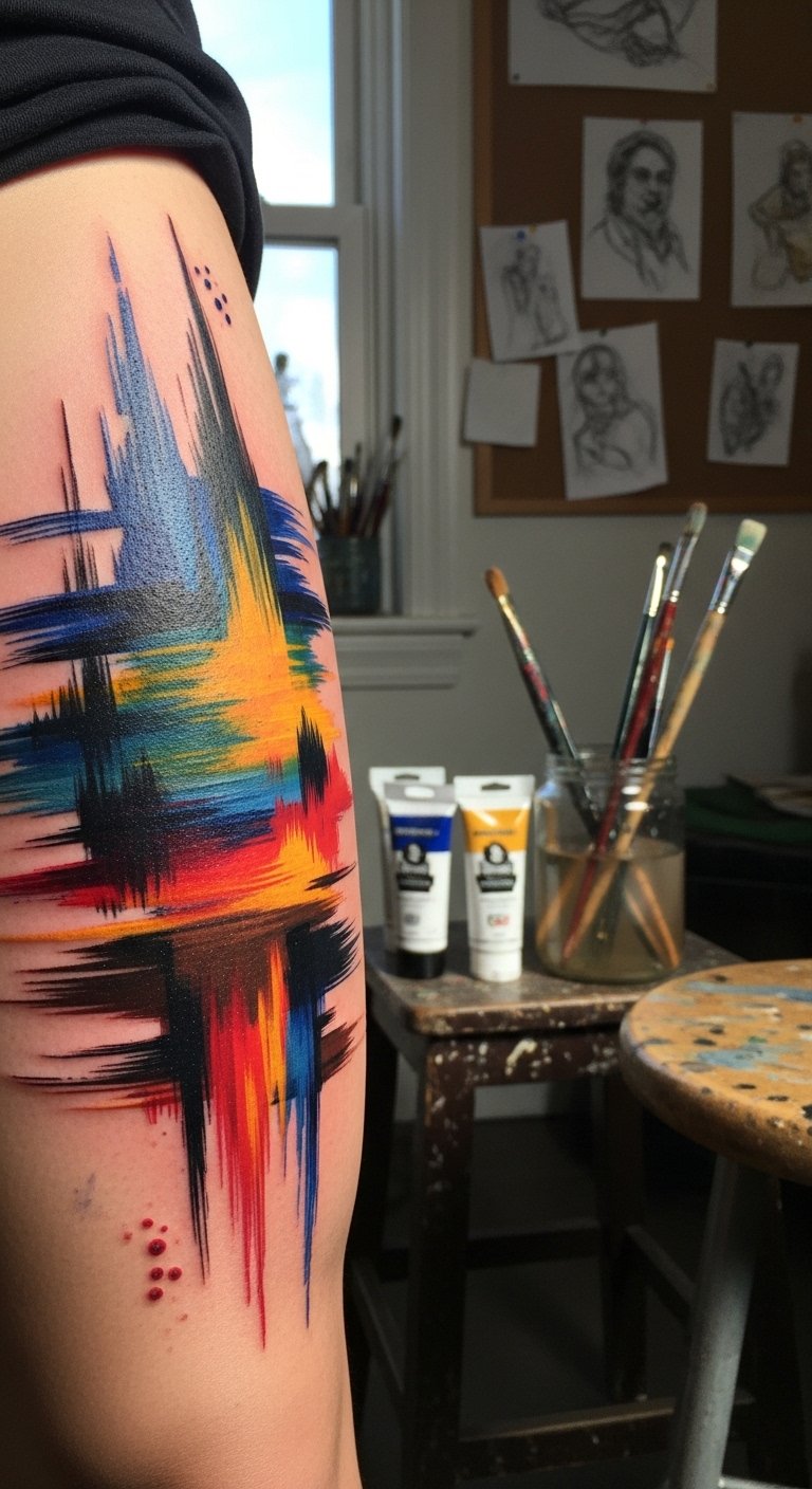 I got an abstract brush stroke on my thigh and it kept its energy because the marks were intentionally large and bold. Abstract work ages like painting, so bigger areas read better than tiny gestures. Artists who can mimic brush stroke textures in ink create a convincing result. Aftercare focuses on preventing scabbing in layered color. For auditioning artists I keep artist-sketchbook examples.