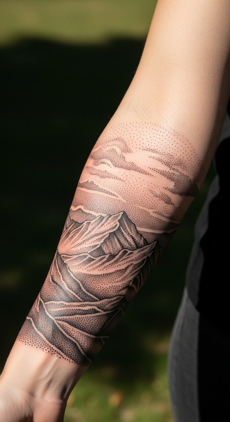 I had a stipple horizon and its texture hid minor spreading, so the scene still reads as dots rather than smudges. Stippling takes time, so choose a patient artist. Larger scenes maintain perspective better than tiny strips. Plan placement to avoid joints that break continuous dot gradients. Healing is mildly slow in dense areas, so follow cleansing and moisturization. I keep dotwork-guidebook for inspiration.