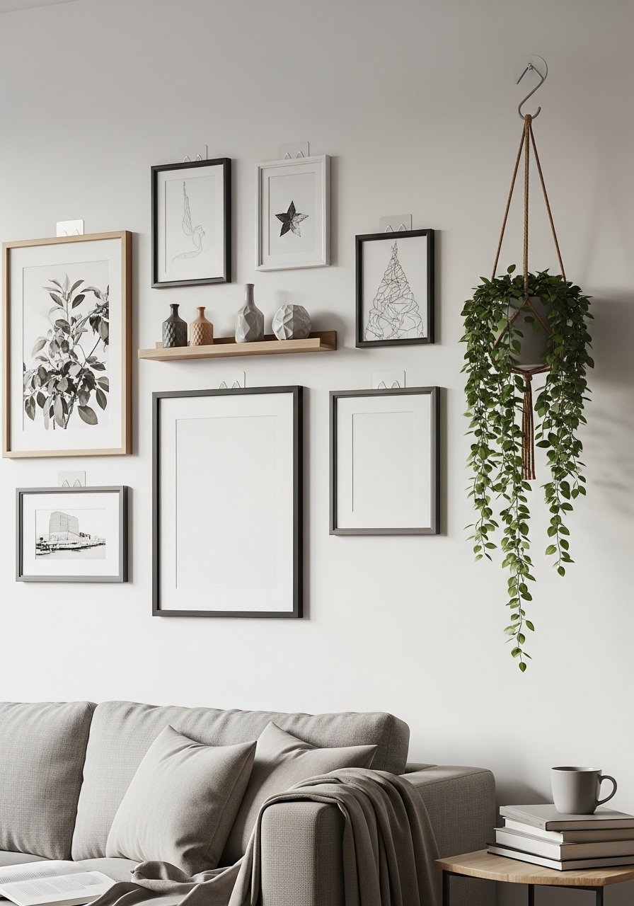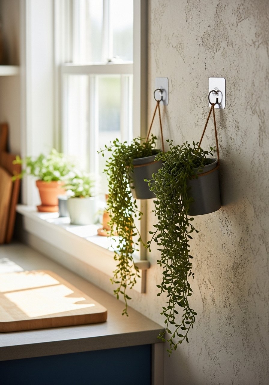 Hanging planters bring life to walls—use removable hooks and lightweight pots. I prefer plants like pothos or string-of-pearls that trail and require small pots. I secure the pot hanger to removable-adhesive-hooks and place a small drip tray under the pot to prevent moisture issues. Plants instantly warm up a blank wall and improve room vibe.