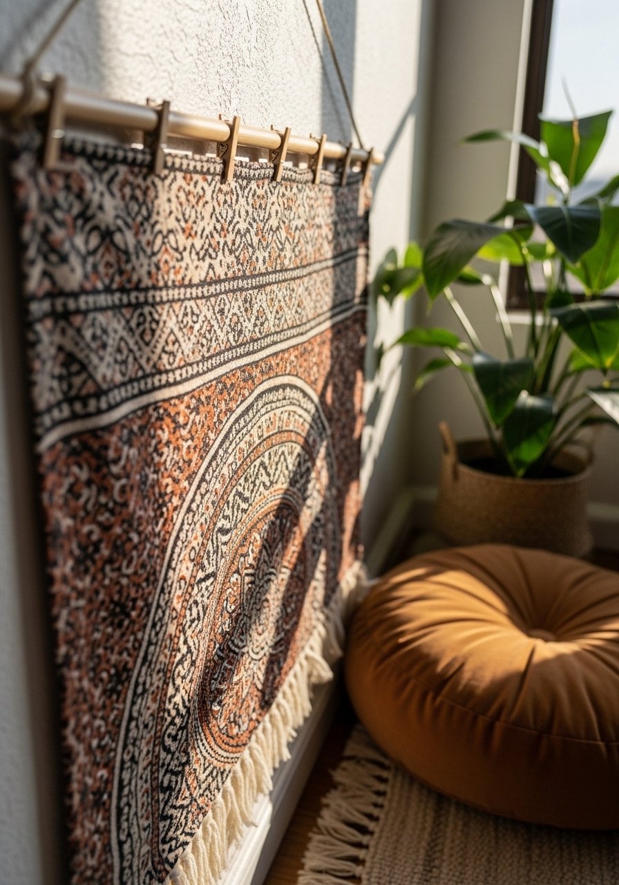 A lightweight tapestry instantly adds color and masks flaws. I hang tapestries with removable-clips or adhesive curtain rings to avoid screws; a slim wooden dowel keeps the fabric straight. For a cleaner edge I use removable-tapestry-clips and secure the dowel with removable-adhesive-hooks. In rentals this feels curated but totally reversible, and it’s an easy way to test bold patterns.