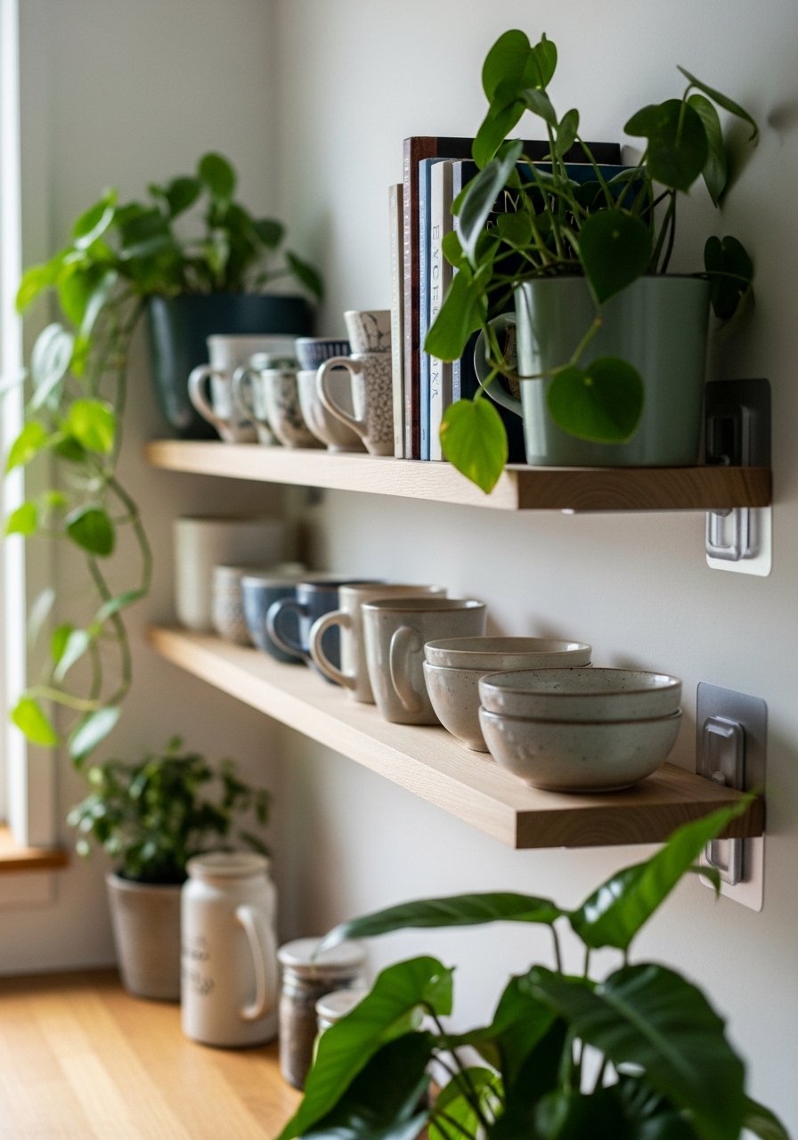 Removable shelving brackets give the floating-shelf look without drilling. Use lightweight shelves and test weight limits—ceramics, plants, and small books work well. I pair shelves with removable-adhesive-hooks or purpose-built removable-bracket kits, keeping display items light. This method cost me about $30 for two shelves and made my hallway feel collected instantly.
