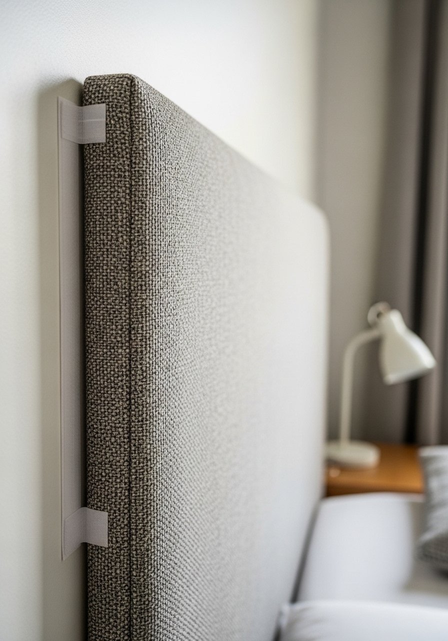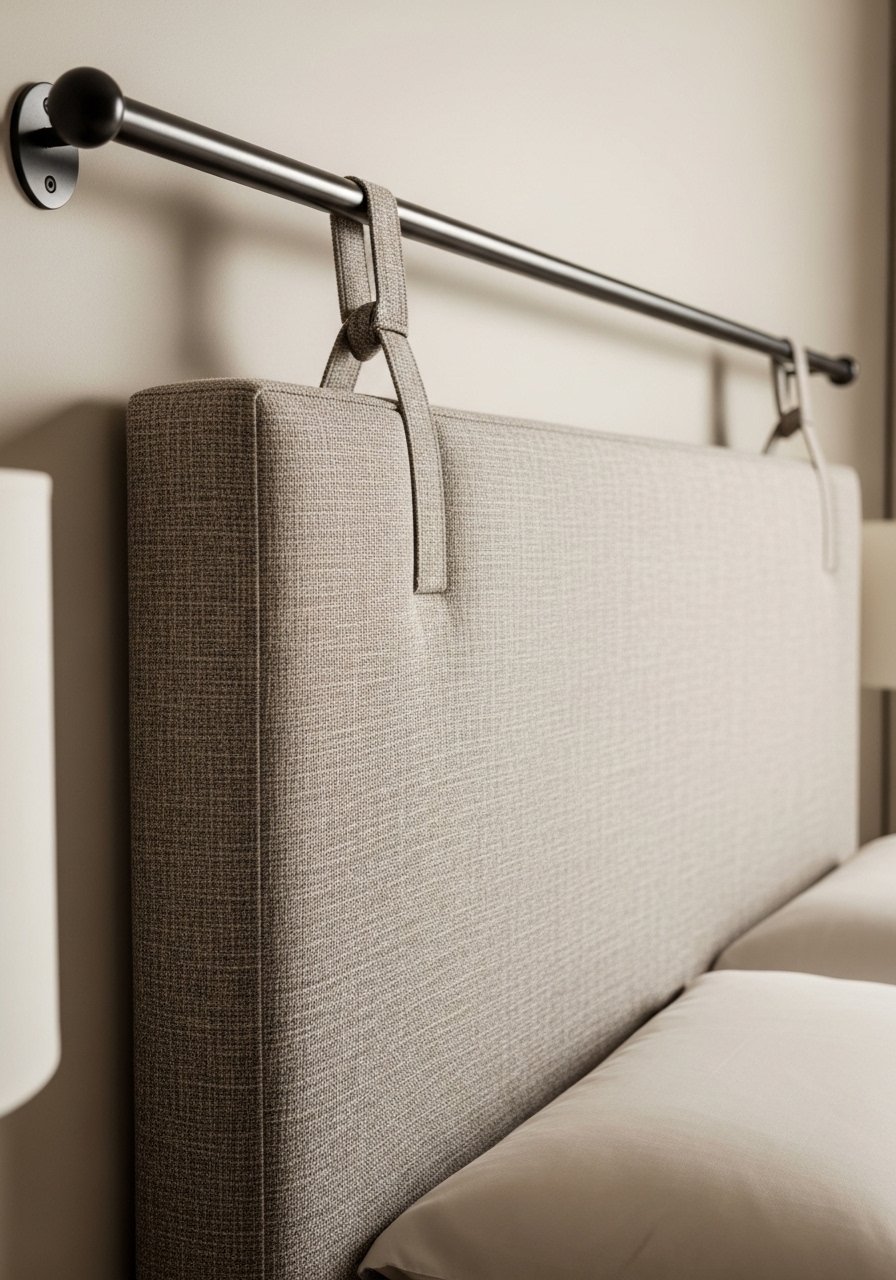 An upholstered headboard can be hung using straps over a mounted tension rod or anchored with heavy-duty removable hooks—no studs required. I prefer a slightly padded headboard to add softness and sound absorption. It’s a renter-friendly way to create a focal point behind the bed that moves with you.