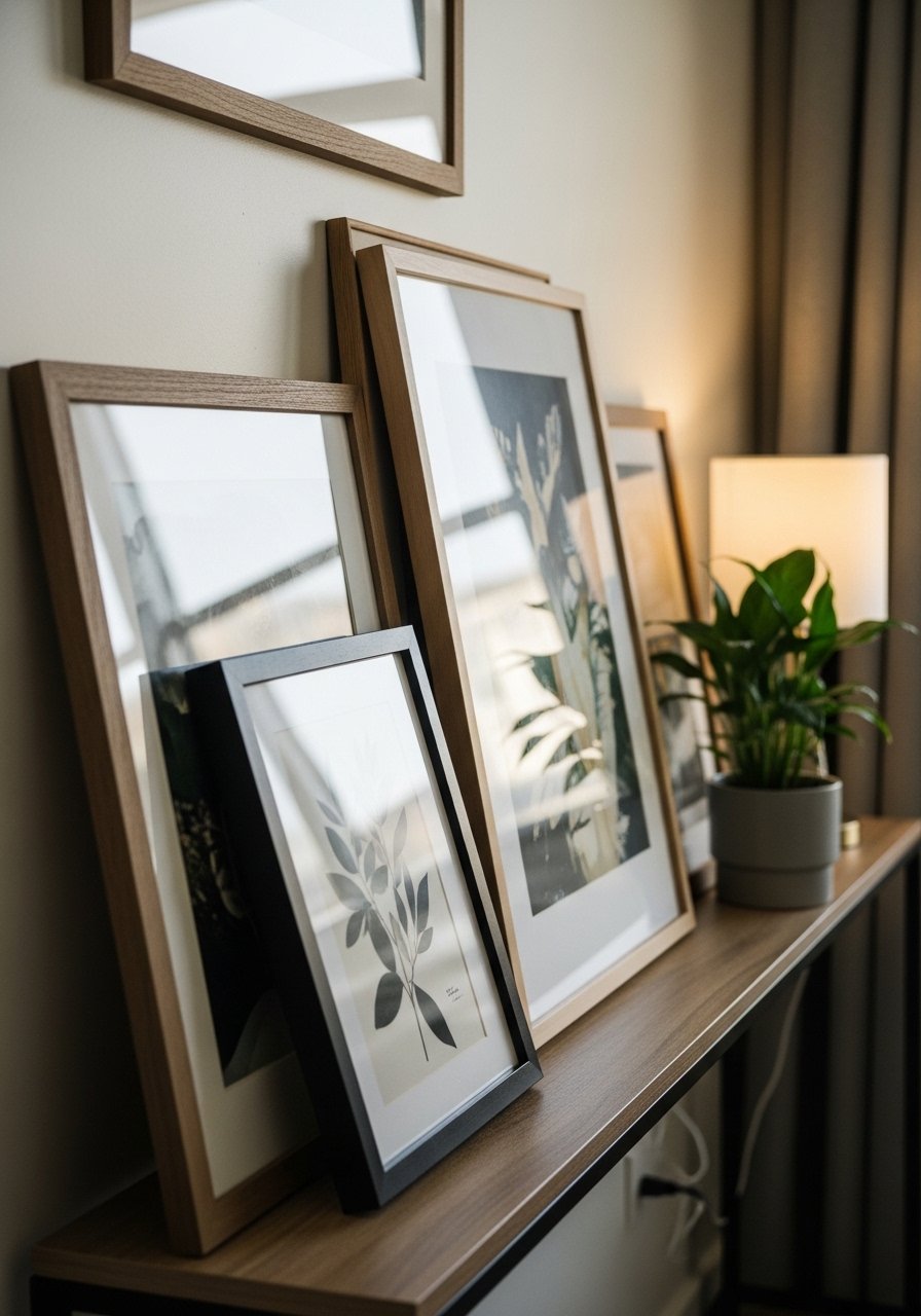 Leaning art on furniture creates an edit-anytime gallery without wall hardware. I mix frame sizes and let taller pieces sit at the back for depth. Add one anchored small shelf for stability. I pair this look with magnetic-poster-frames for easy swaps. I’ve used this in entryways to switch out seasonal prints quickly.