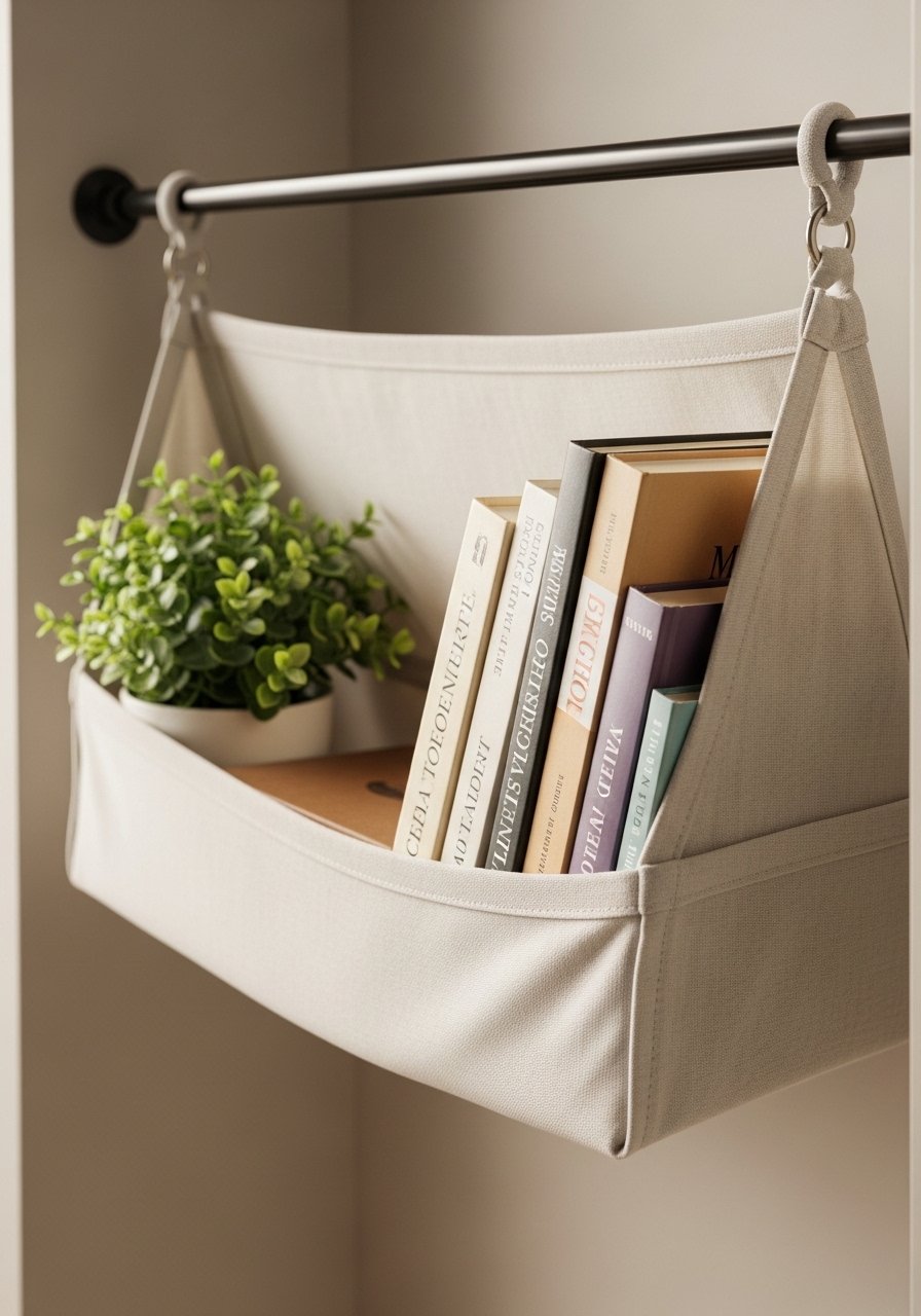 I use a tension rod with suspended fabric shelves for lightweight storage—books, plants, and small decor. Tension rods work great inside alcoves and between trim, creating a floating-storage feel. I find the setup simple with a tension-rod-kit and sturdy fabric pouches. It’s a unique, damage-free way to add function to shallow walls.