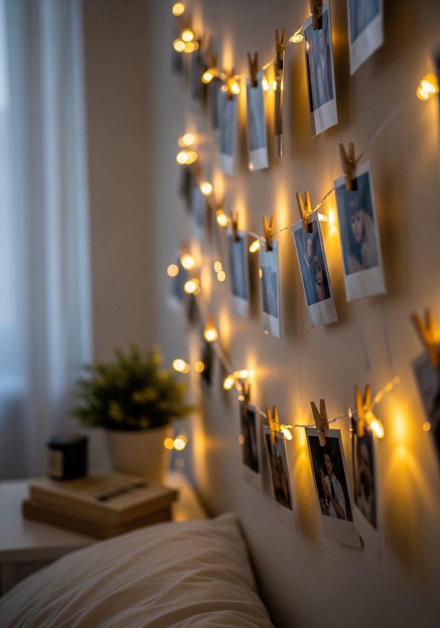String lights with photo clips add warmth and memory displays—battery-operated styles avoid outlets and cords. I attach the ends with removable hooks and space pictures along the cord for even glow. I use battery-operated-led-puck-lights when I need extra illumination. This setup is inexpensive and gives walls personality fast.
