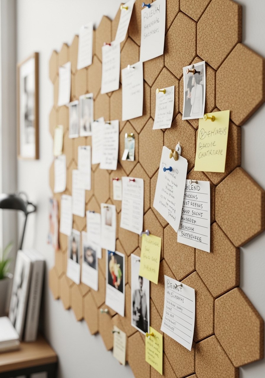 I install peel-and-stick cork tiles to create a notice wall that’s functional and decorative. It’s perfect for home offices, kitchens, or craft spaces—pin anything without damaging paint. I use small tiles so I can create patterns and replace tiles as needed. This solution costs about $30–$90 depending on area and is a favorite for staying organized when I’m juggling projects.