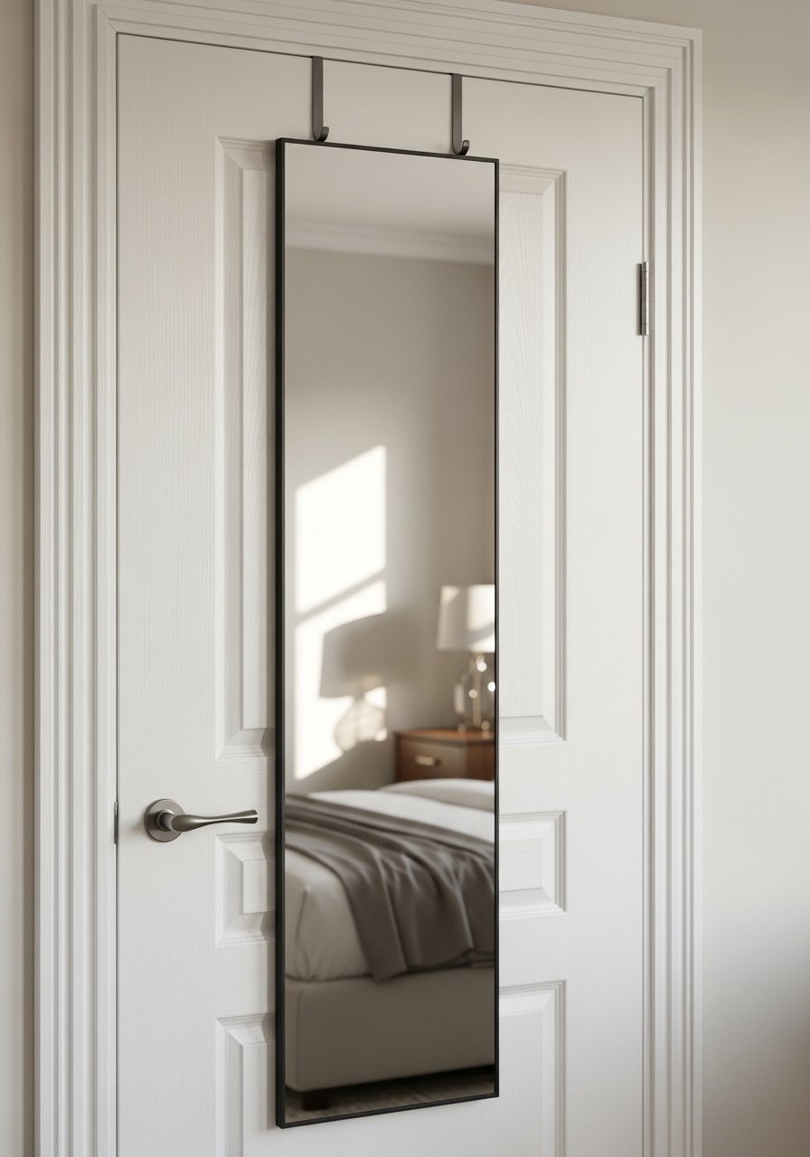 An over-the-door mirror brightens and gives the illusion of depth without wall work. I use padded over-the-door hooks to protect finishes and add a thin frame for polish. This approach is cheap—under $50—and moves with you between homes. It’s one of the fastest ways I’ve found to lighten a dim room.