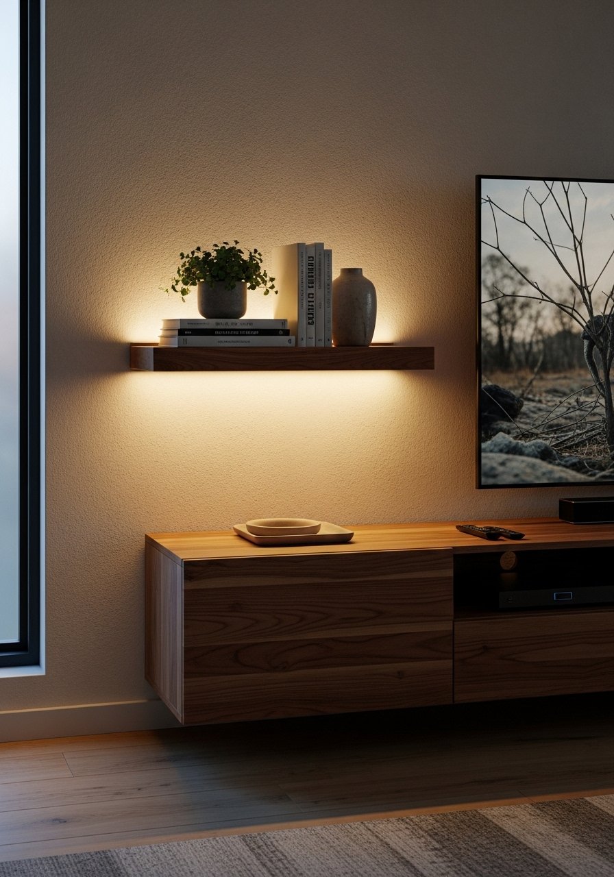LED strips add ambiance and depth when hidden behind shelves or frames. I stick LED strips with their adhesive backing and route wiring to a nearby outlet, or choose battery-operated versions for total freedom. I often use warm-white strips to make art and shelving feel intentionally lit. It’s subtle but changes how the wall reads after dark.