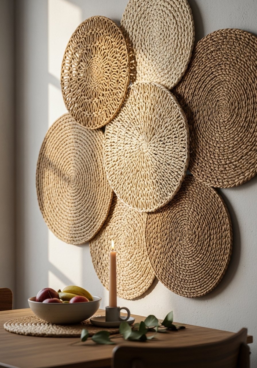 Woven mats and chargers mounted with removable hooks make unexpected wall art. I group round mats in odd numbers for rhythm and use small adhesive pads on the back. This is budget-friendly—many mats are under $10 each—and gives a handmade, global feel without permanent change. It’s a staple for renters who like eclectic texture.