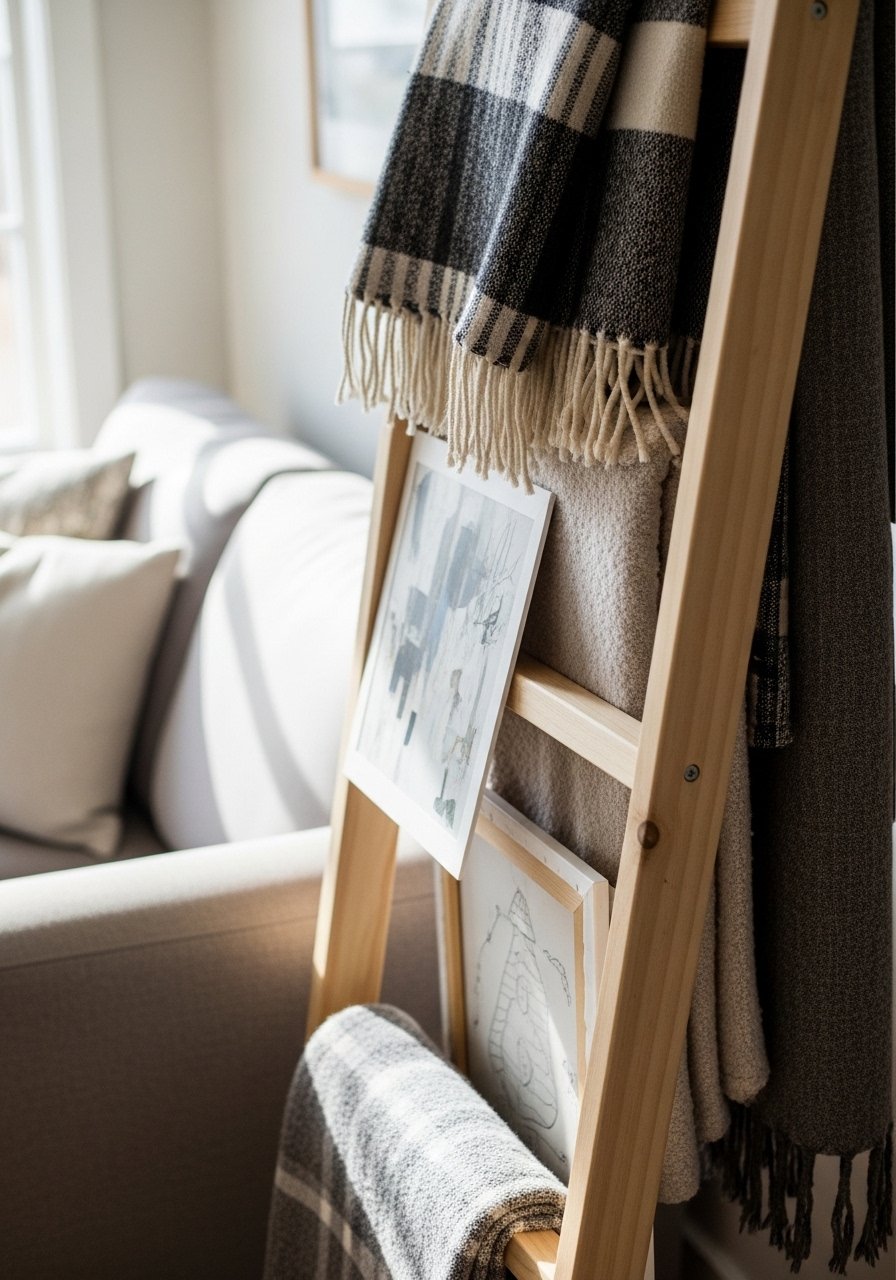 A leaning ladder gives vertical interest without touching the wall—drape throws, hang frames from rungs, or clip string lights. I prefer slim ladders that fit behind furniture and avoid slipping by adding a non-slip pad. It’s movable and works in most rooms; I often reposition mine seasonally for fresh layouts.