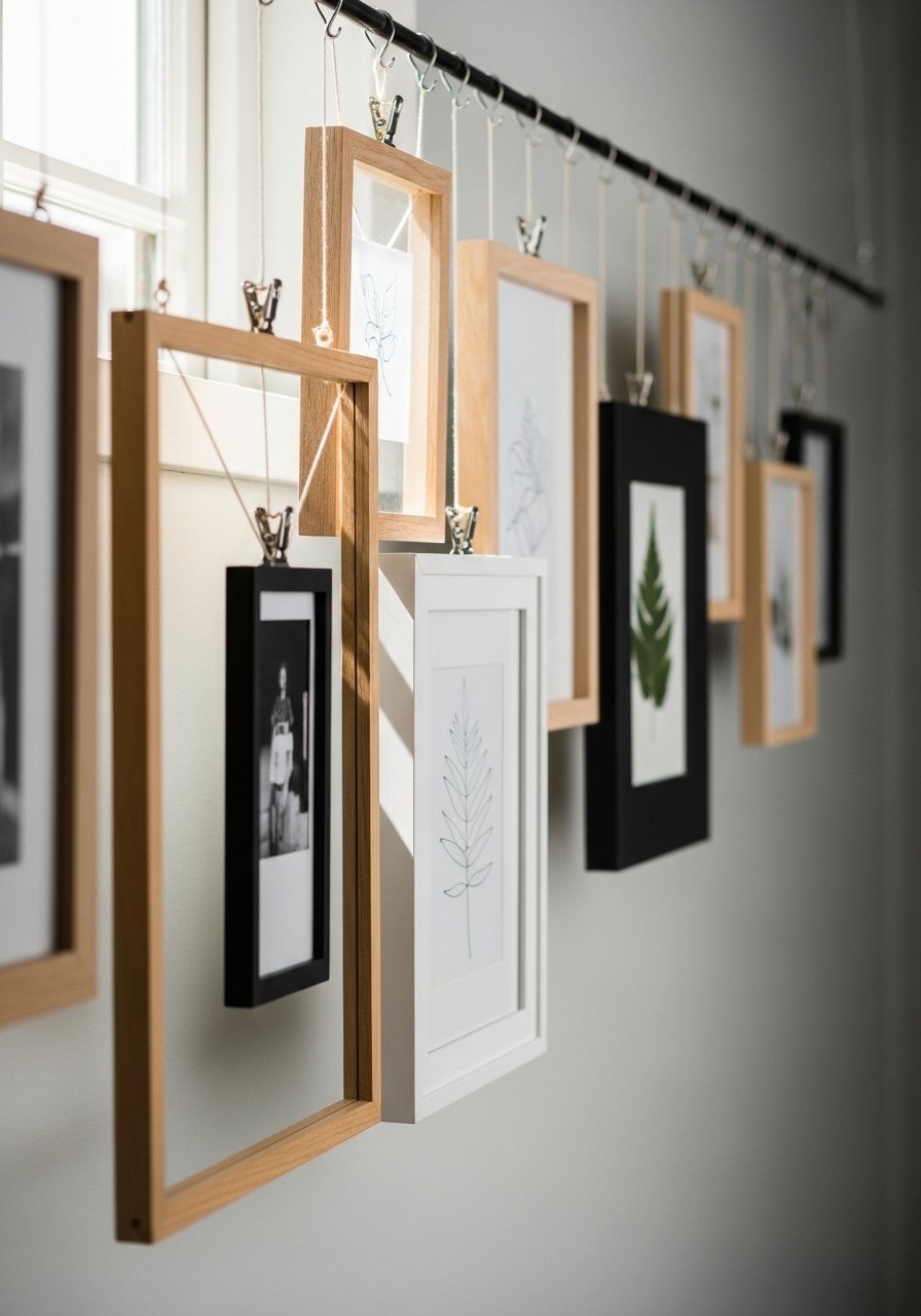 A horizontal tension rod across a hallway lets you hang frames from clips—easy to rearrange and completely non-invasive. I suspend frames with twine and clip them at varied heights for visual interest. Use a tension-rod-kit sized to the opening. This method feels custom but leaves walls untouched.