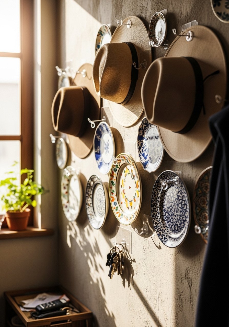 I create functional galleries with hats, plates, or baskets hung on removable hooks—this doubles as storage and decor. I place heavier items nearest structural supports or choose lighter pieces for adhesive hooks. Plates look intentional when grouped and can be rearranged easily. This is a quick way to show personality without wall damage.