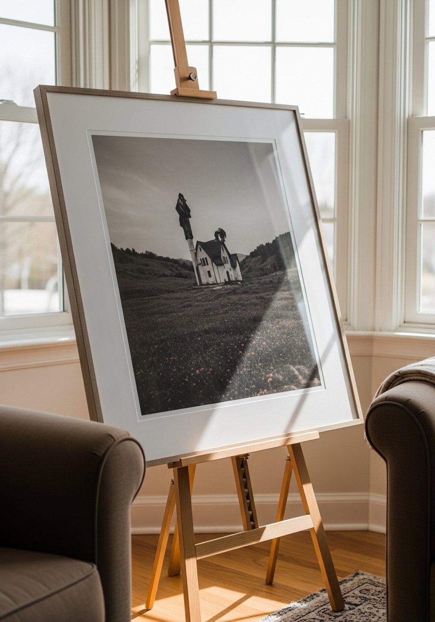 An easel is an elegant freestanding way to display large artwork without wall mounts. I rotate pieces based on mood and season, and easels double as statement furniture. I often prop prints on an easel beside a reading chair for a gallery effect that’s entirely non-invasive.