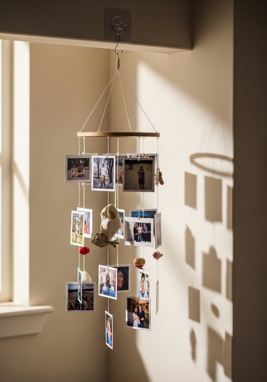 A hanging mobile of photos and ephemera brings motion and personal history to an empty corner. I hang the mobile from a single removable hook and balance pieces so it turns gently in drafts. It occupies vertical space beautifully without touching paint except for that one hook.