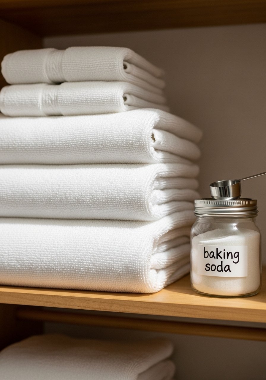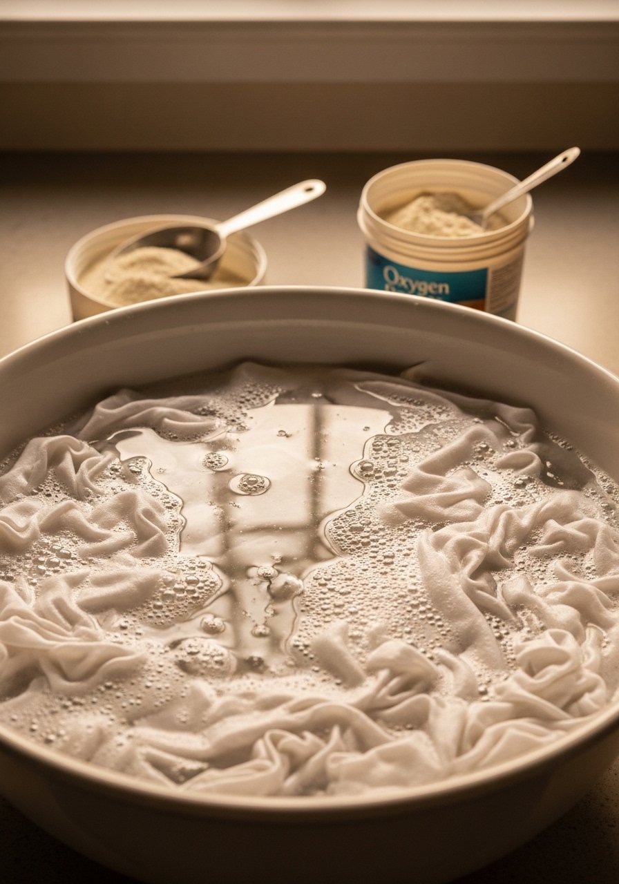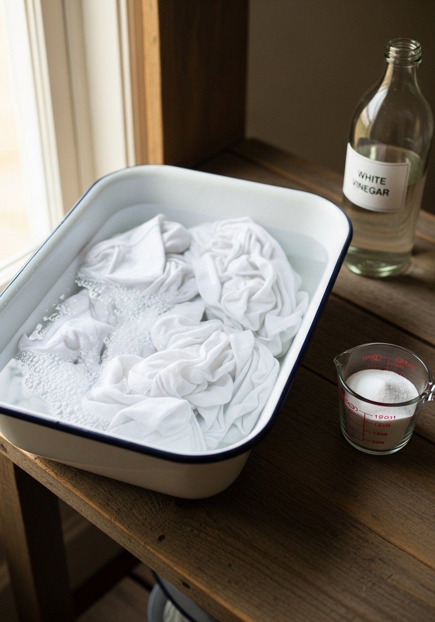 When things look dull, I dissolve half a cup of baking soda and a cup of distilled white vinegar in warm water, then soak for an hour. It brightens without harsh bleach. I use baking-soda from my pantry and a splash of distilled-white-vinegar. I noticed the fabric softens too, which is a nice bonus on towels and tee shirts.