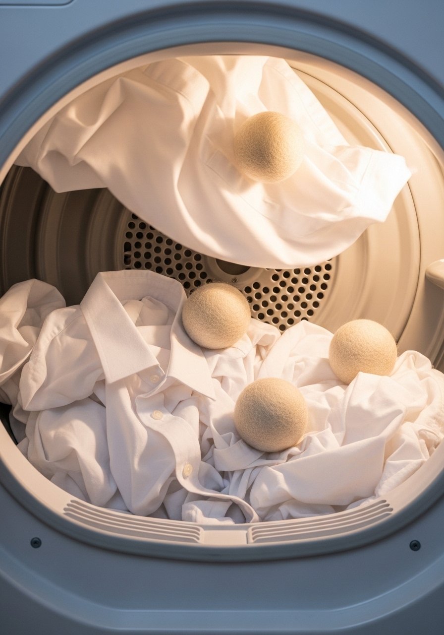 I toss a couple of wool dryer balls into the white load and avoid overfilling the dryer. They keep items from clumping and reduce static without softener residues. It helps whites dry evenly and prevents uneven browning from too little circulation. I use a low to medium heat to avoid overcooking fibers.